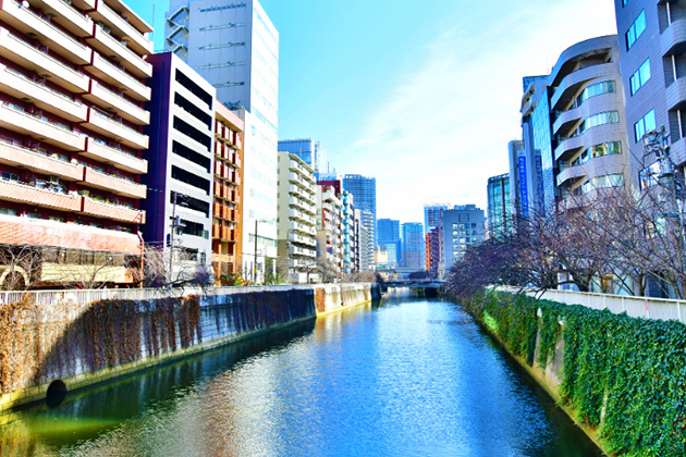 五反田駅のすぐ近くを流れる目黒川沿いには桜並木があり、春が訪れると咲き誇る桜の景色は多くの見物客で賑わいます。